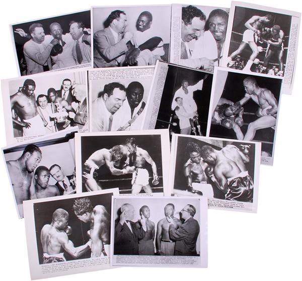 One lot of thirteen wire photos related to the October 1954 fight in Philadelphia. Includes weigh-in, fight action, and shots of the Johnny Saxton individually. Most about 8 x 10''. EX-MT.