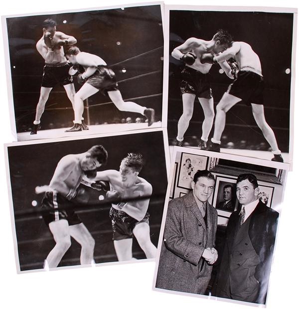 Three 8 x 10'' fight action photos dated 1/12/38 and a great 7 x 9'' shot of the two fighters shaking hands dated 1/24/38. Caption sheets attached to the back of each. EX/EX+.