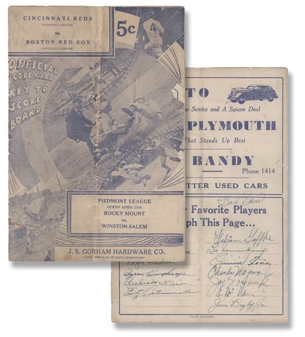 During a circa 1940 pre-season, the Boston Red Sox squared off against the Cincinnati Reds at their Piedmont League farm team's home stadium in Rocky Mount , North Carolina. Here is the program from that game with (14) signatures that include greats like Jimmie Foxx, Bob Doerr, Roger Cramer, Eric McNair and Joe Vosmick. Signatures rate an 8/9 on the back of a 16 page program with some toning, edge wear and tear and a vertical fold down the center. Great baseball relic.