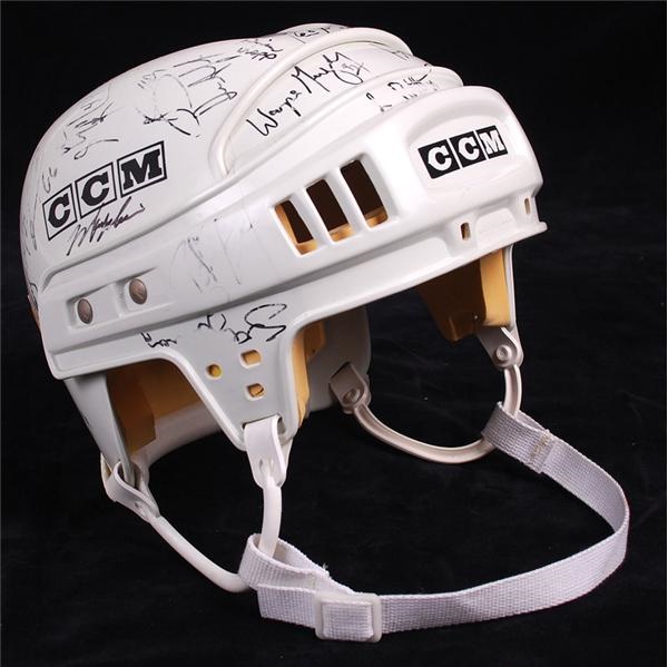 Signatures include Gretzky, Yzerman, Coffey, Bourque, Chelios, Francis, Lemieux, Messier, Neely, Hull, and many more. Thirty total signatures. Most of the signatures have some smudges or fading. VG-EX.