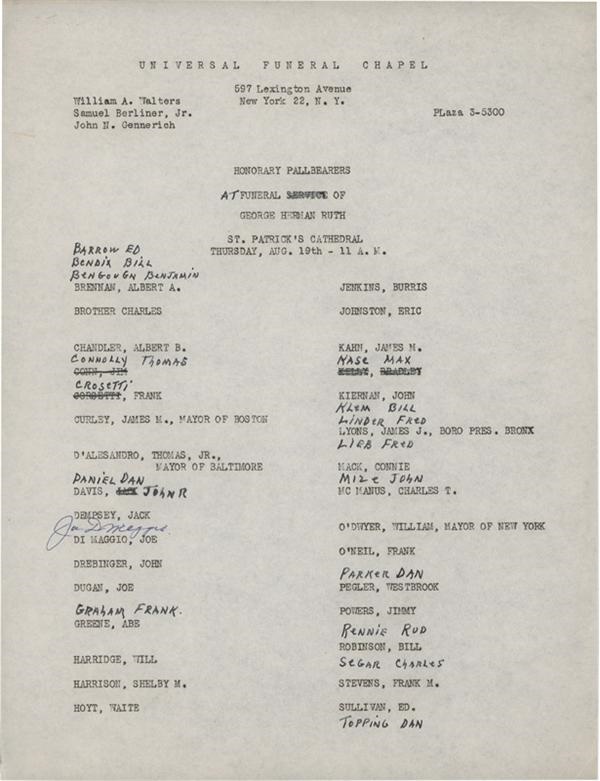 George Herman "Babe" Ruth, one of the greatest figures in sports history, died on August 16, 1948. This original list of honorary pallbearers at Ruth's funeral, is mint signed by Joe Dimaggio in blue ballpoint. It is typed on 8 1/2 x 11 bond paper with some names written in by hand. Names on the list (in addition to Dimaggio) include James Michael Curley, Mayor of Boston, Connie Mack, Ed Sullivan, Jack Dempsy, William O'Dwyer, Mayor of New York. It is in EX-NRMT condition. Probably one of a kind. The funeral took place August 19, at St. Patrick's Cathedral, New York. Babe Ruth died at age 53. His body lay in repose in Yankee Stadium before the funeral which was two days later. Ruth was then buried in the Cemetery of the Gate of Heaven in Hawthorne, New York.