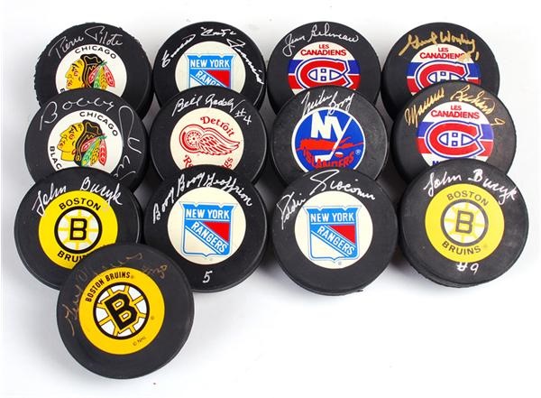 Nice collection of (13) signed hockey puck with star and Hall of Famer autographs. Players represented include: · Maurice Richard on Canadiens puck · (2) John Bucyk on Bruins puck · "Boom Boom" Geoffrion on Rangers puck · Gerry Cheevers on Bruins puck · Pierre Pilote on Blackhawks puck · Bobby Hull on Blackhawks puck · Jean Beliveau on Canadiens puck · Bill Gadsby on Red Wings puck · Mike Bossy on Islanders puck · Ed Slowinski on Rangers puck · Emile Francis on Rangers puck · Gump Worsley on Canadiens puck Signatures rate 7 to 10 in silver and gold paint pen.