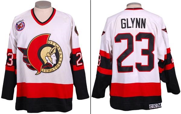 Home white jersey has original number 23 on back and both sleeves but the name was changed to "Glynn" (likely from Chris Luongo) by the team after the 1992-93 season. Stanley Cup 100th Anniversary patch on the right breast. Nice use with stick marks, team repairs, burns, paint tranfers, and pilling inside. Maska and size 54 tagging in the collar.