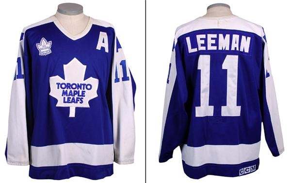 Blue jersey has Leeman's name sewn on a plate on the back. "H.E. Ballard 1903-1990" patch sewn on right breast.The Harold E. Ballard patch was worn by the Maple Leafs during the 1990-91 season. In the 1991-92 pre-season, the Maple Leafs wore jerseys with the Ballard patch removed, but were recycled from the 1990-91 season. This jersey is from that set which originally had the Ballard patch. It was removed and then reattached. Maska tag in the collar. Assistant captain's "A" on the left breast. Nice use with stick marks, snags, paint transfers, burns, blood, a small team repair and pilling inside.