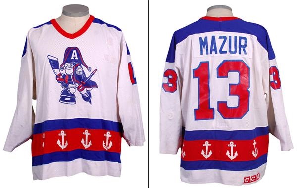 White jersey has name screened on a plate on the back. Number 13 heat pressed on back and both sleeves. Crest is screened on the front. Maska tag in the collar. Lots of use with team repairs, stick marks, burns, paint transfers and un-repaired rips.