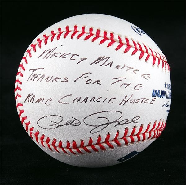 Official Major League Selig Baseball signed by Pete Rose with the inscription "Mickey Mantle / Thanks for the / Name Charlie Hustle." Mint.