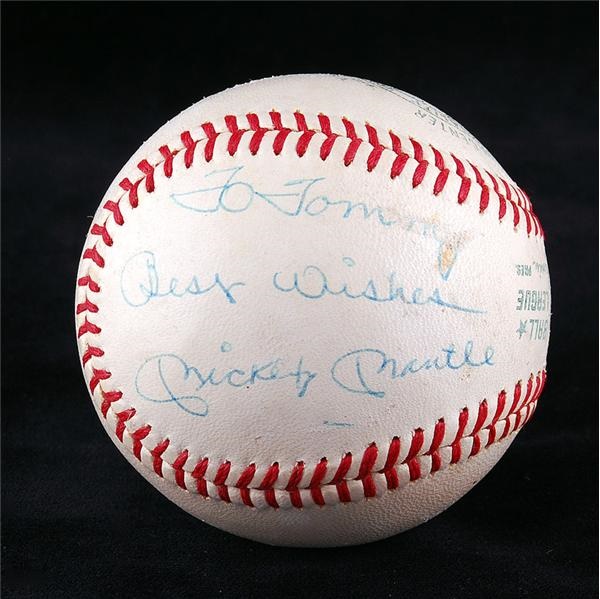 Official American League Cronin Baseball singed on the panel by Mickey Mantle with the inscription "To Tommy Best Wishes Mickey Mantle." A couple of minor scuffs on the surface, one of which touches the last couple of letters of the word "Tommy." League stamping is strong, ball is just off-white in color. Includes a LOA from JSA.