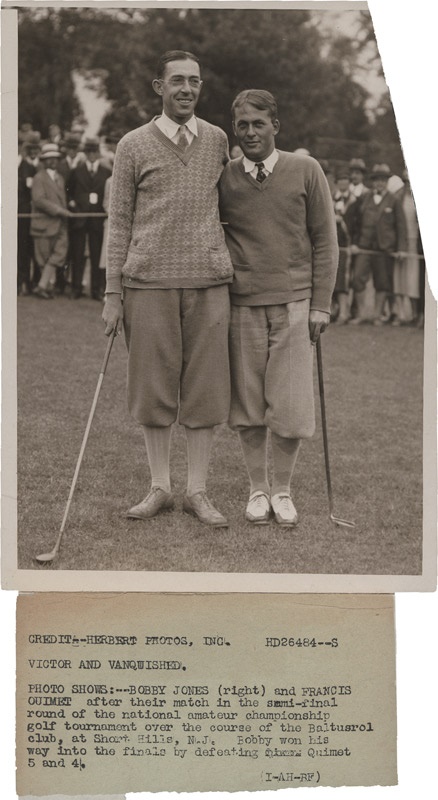 6 x 8'' news service photograph of Bobby Jones and Francis Ouimet. Taken just after Jones had just defeated Ouimet at the Semi-Final round of the National Amateur Championship in Short Hills NJ. Caption sheet attached to the back. Piece missing in the upper right corner, image is clear.