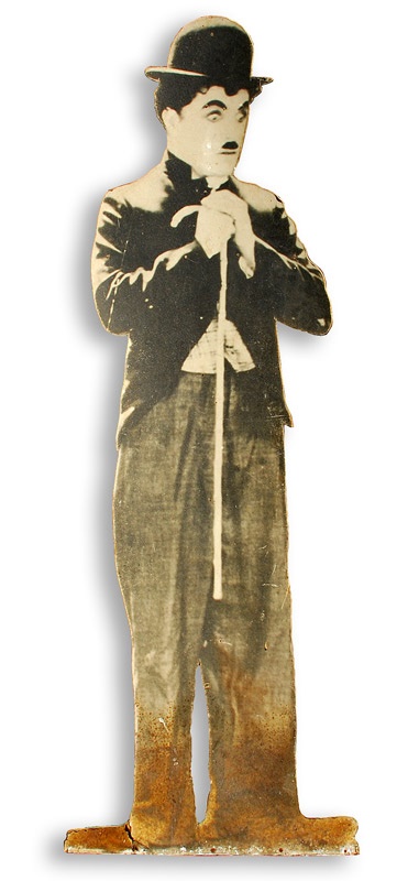 Vintage 71'' tall standee on thick cardboard with wooden easel back. Label on the back that it was made by "King Display's Inc." Some warping, fading and staining near the base from exposure to the elements. Undated, but not a modern piece.