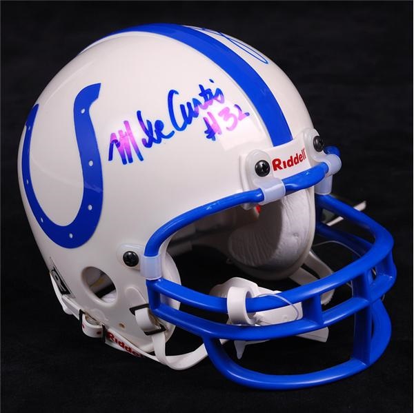 Riddell mini helmet signed by Johnny Unitas and Mke Curtis of the Baltimore Colts in blue sharpie. Unitas has added the inscription "HOF 79."