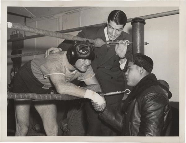 7 x 9'' news service photograph of Joe Louis shaking hands with Jim Braddock while Joe Dimaggio stands smiling over them. Caption sheet attached to the back. EX/EX+.