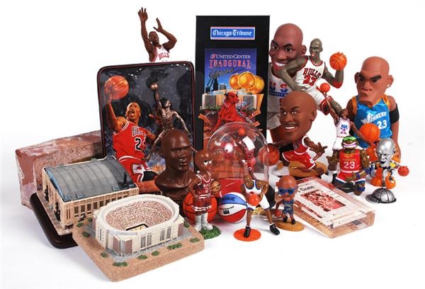 Interesting lot related to Micheal Jordan and the Chicago Bulls. Includes box of about 15 small statues/figurines/dolls, several tickets (MJ Retirement Night, Tribute to Micheal Jordan and United Center Inagural Game), several commemorative coins and pins, limited edition United Center model, American Sports Icons Ltd Ed Plate/statue, Chicago Stadium model by Danbury Mint, Original brick from Chicago Stadium w/ plaque and more.