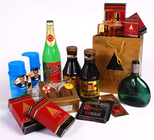 Several scarce pieces in this lot. Includes Knock Out High Punch Strong Beer Bottle (empty), The Champs Gel and Shaving Cream (3), Old Kentucky BBQ Sauce (2), Fiber Tea Pills Box with contents, Champion Brand Aftershave tag (Signed by Ali and dated 1988), "Float Like a Butterfly Sting Like a Bee" decanter (very rare, we've never seen this piece before), few packages of cologne and more.