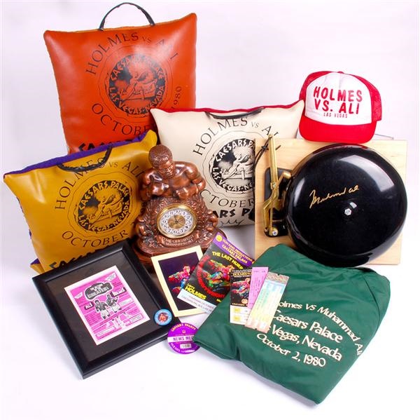 Neat lof of material related to this classic match-up with some pretty scarce pieces. Includes leather seat cushion, handbill picturing both fighters, dated hat, dated jacket, large 14'' tall metal figural clock (Nice!), 3'' diameter media pin, three different full tickets, $10 poker chip picturing Holmes, promotional brochure, Muhammad Ali signed bell, and more.