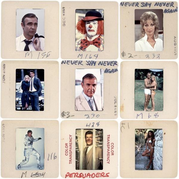 Huge collection of over 175 different 35mm color slides picturing cast members of various James Bond movies. Several date from the as early as the 1960s but most are keyed to the movies of the late 1970s and early 1980s . Includes single cast members (Sean Connery, Roger Moore, Timothy Dalton), scenes from the movies and candid shots (several of various Bond babes). Mixture of those issued by the movie studio and those taken by independant professional photographers. Obviously from the archives of a movie magazine.