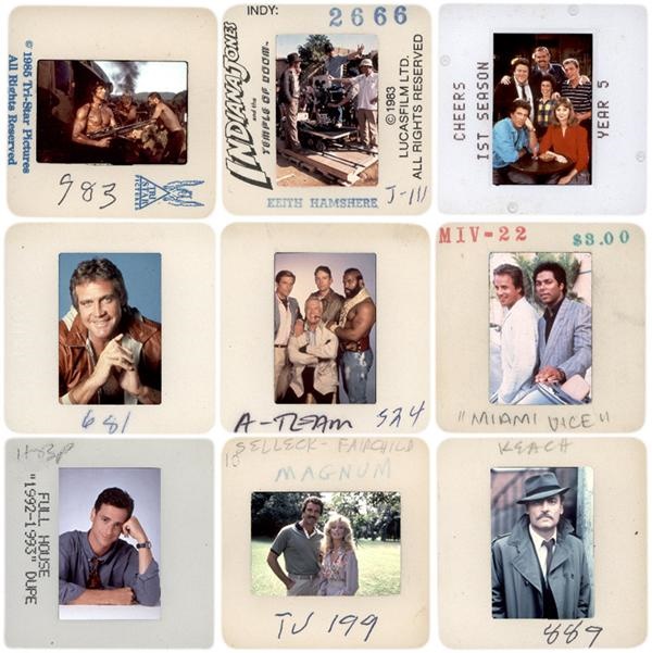 Huge collection of over 800 different 35mm color slides picturing cast members from many television shows and movies. Several date from the as early as the 1960s but most are keyed to shows and movies of the early 1980s. Includes single cast members, entire casts, scenes from the shows/movies and candid shots. Some bigger names (mulitples of everybody) include Harrison Ford (Indiana Jones), Tom Cruise, Mel Gibson, William Shatner (100+), Tom Selick (Magnum PI), etc. Shots from Family Ties, TJ Hooker, Magnum PI, Cheers, The A-Team, Perfect Strangers, Dallas, The Love Boat, Northern Exposure, MacGyver, Wings, Knight Rider, Rambo, Cagney & Lacey, Remington Steele, NYPD Blue, Miami Vice, Back to the Future, The Russia House and the list goes on and on! There are a mixture of those issued by the movie studio and those taken by independent professional photographers. Obviously from the archives of a movie/entertainment magazine.