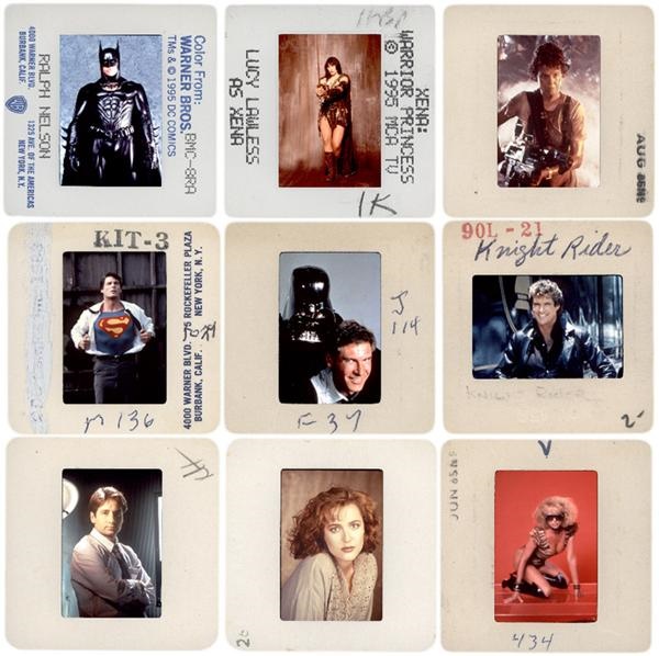 Huge collection of over 400 different 35mm color slides picturing cast members from many television shows and movies with Sci-Fi themes. Several date from the as early as the 1970s but most are keyed to shows and movies of the 1980s. Includes single cast members, scenes from the shows/movies and candid shots. Some bigger names (mulitples of everybody) include Star Wars, Bat Man movie, Alien, Stargate SG-1, Highlander, "V", Xena, Hercules, Doctor Who, Mission: Impossible, Space, Sliders, Batman, Superman, X-Files, Knight Rider, etc. Mixture of those issued by the movie studio and those taken by independent professional photographers. Obviously from the archives of a movie magazine.