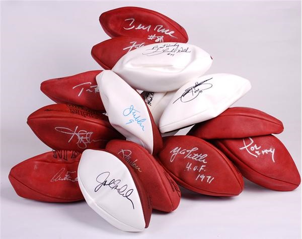 Includes Hershal Walker, Steve Young, Lawrence Taylor, YA Tittle, Dan Fouts, John Elway, Joe Perry, John Madden, Fred Biletnikoff, Daryl Lamonica, Jimmy Johnson, Jerry Rice, Tom Brady, Matt Hasselbaeck, Rocky Bleier, Sonny Jurgenson, and Ken Stabler. . Many have added uniform numbers or thier year of Hall of Fame Induction. All are signed on official NFL or white panel balls in bold sharpie.
