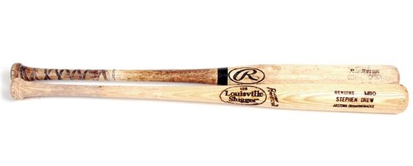 Bats used by two promising Diamondback rookies in 2006. Includes Louisville Slugger M110 used by Stephen Drew. Written on the knob in black sharpie is "M110 33 1/2 - 31 6". Cracked at the end of the barrel. Also includes Rawlings Big Stick used by Conor Jackson. Written on the knob "34-32 16" in black sharpie. Stamped into the knob "822B 256 06." Cracked, shows an absolute ton of use! Two bats total.