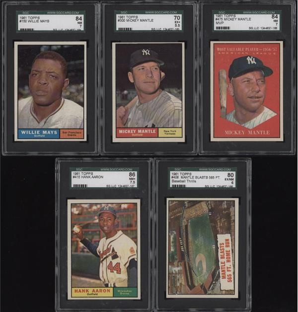 Includes: #415 Hank Aaron SGC 86 NM+ 7.5 #150 Willie Mays SGC 84 NM 7 #475 Mickey Mantle MVP SGC 84 NM 7 #406 Mantle Blasts 565 FT SGC 80 EX/NM 6 #300 Mickey Mantle SGC 70 EX+ 5.5
