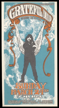 Eerily prophetic, this concert handbill depicts Grateful Dead member Pigpen as an angel with wings years before his premature death from alcohol abuse. It was made to advertise a March 24th concert in Grand Rapids, Michigan that was later cancelled. Exceedingly rare! NRMT.