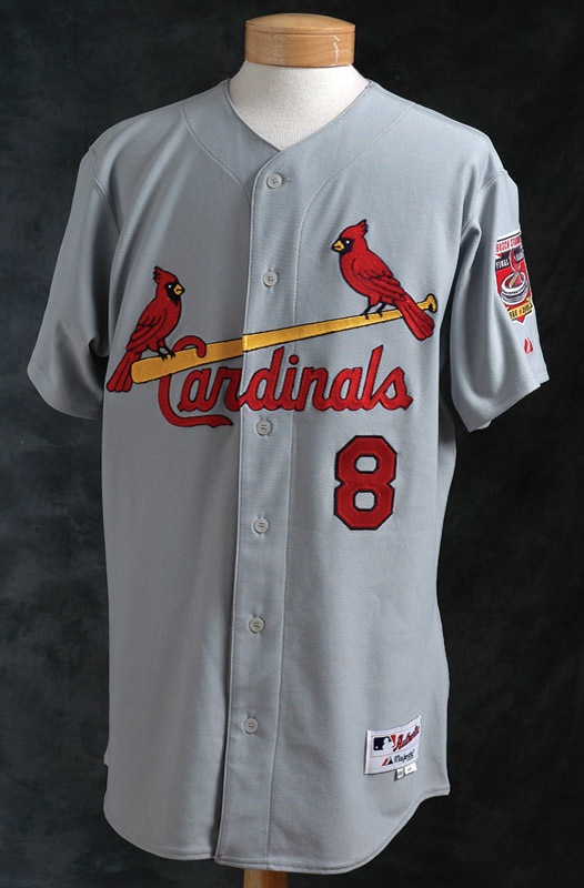 This fine, gray "road" jersey from the Cards' second baseman was worn during the final season at historic Busch Stadium. On the chest is the team logo displayed elegantly along with "Cardinals" in deep red and brilliant yellow across the button-down front. "Grudzielanek 8" fills the opposite side in red-on-blue tackle twill and a large patch commemorating the historic closing of the field is sewn to the left sleeve. Manufactured by Majestic Authentic with their tagging on the tail along with a [size] "46" and "2005" flag tag “2005.”