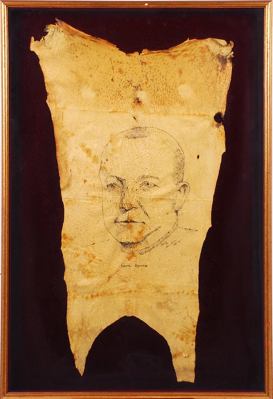 An interesting piece of ink-on-stretched leather artwork created by Bill Ellis, a student from Notre Dame who most likely played at one time for the gridiron legend. Created in 1933 shortly following his tragic death during a plane crash and only three years removed from the close of his coaching career in which he posted an astonishing all-time winning percentage of .881 and six National Championships. Measure 33" in length and is framed to 27"x36".