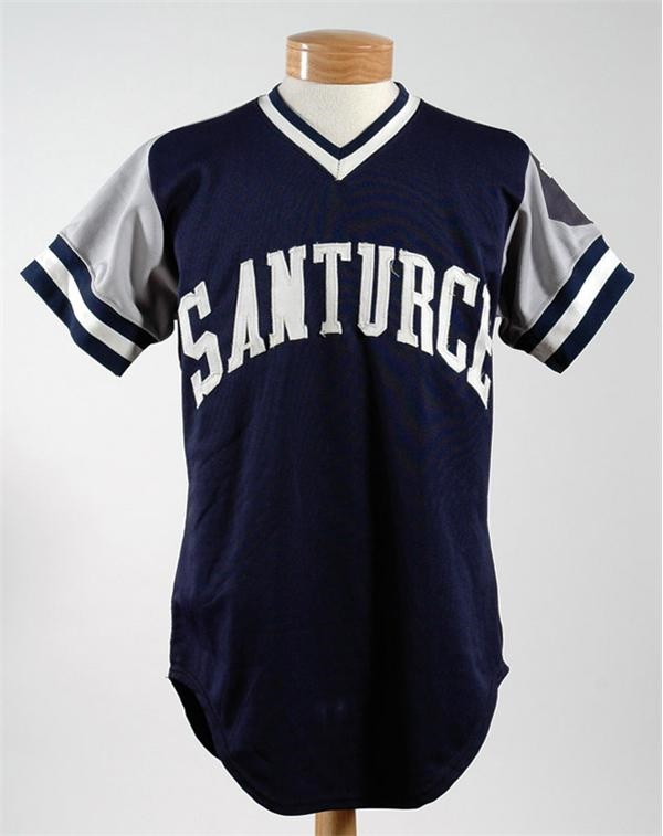 A legend in his native Puerto Rico, Sandy Alomar was a slick fielding second baseman during his 15-year MLB career. His influence on the game lasted long after his playing days were over...thanks to his sons Sandy Jr. and Roberto. Offered is his PBLPR Crabbers "road" jersey worn during his days as player and manager for the international powerhouse. "Santurce" is sewn across the front in white tackle twill, while on back "S. Alomar" arches above his number "2" on a matching navy nameplate. On the left sleeve is a circular patch in which "2" appears again, and inside the collar is "Wilson [size] 40" tagging. Nice all around use can be found throughout this rare import. Terrifico!