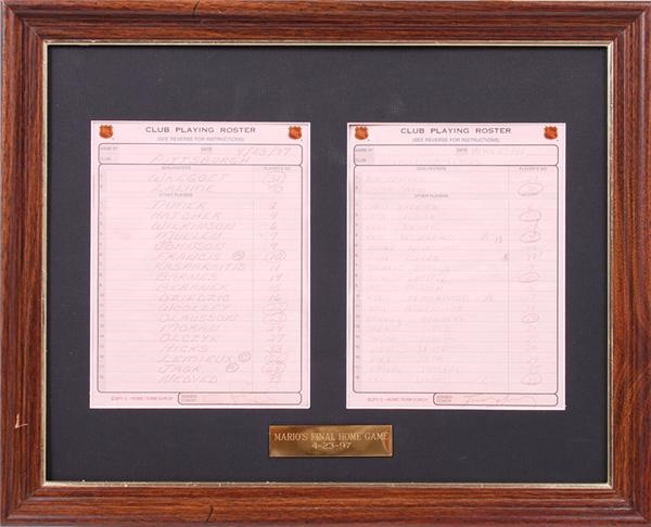 Mario Lemieux's first retirement occurred in 1997. His last game that season was on April 26, versus cross state rival the Philadelphia Flyers. This is the Club Playing Roster, aka line up card for that game for both the Penguins and Flyers. This is copy 2 which went to the home coach. Nicely framed piece is 16" x 13".