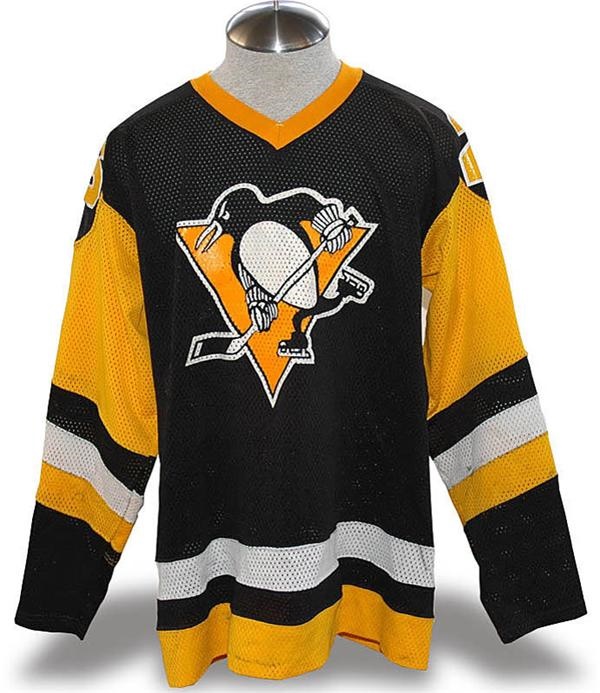 Right winger Mike Blaisdell played two seasons with the NHL's Pittsburgh Penguins. Here is a fantastic game used #26 jersey from his 85-86 season. Cooper and Century Sports embroidery is found on the back tail. Cooper and size (large) tags are sewn inside the collar. This great jersey has tough style stick marks and dozens of repairs.