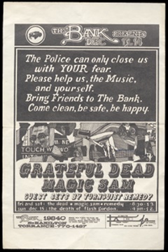 The Bank in Torrance, California, like many clubs in the 1960's, suffered from police harassment, leading the promoters to appeal to the public in their advertising for help - "Bring Friends to The Bank. Come clean, be safe, be happy." This handbill features the Grateful Dead and Magic Sam appearing on December 13th - 14th, 1968. Folded in quarters, VG+. Extremely rare in any condition.