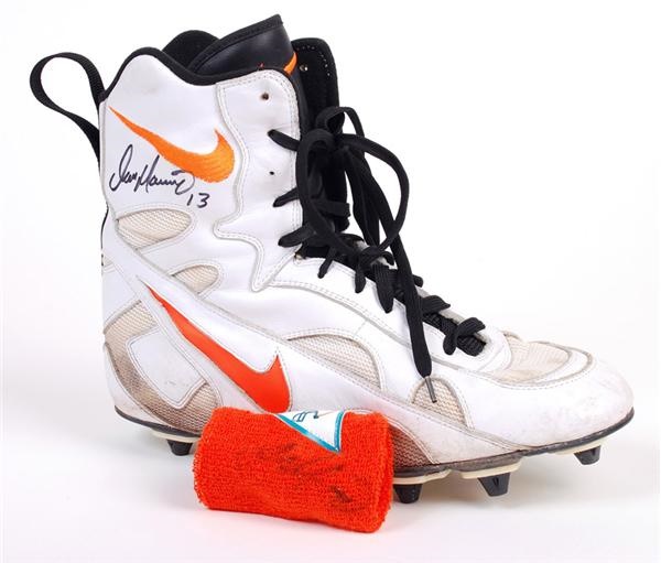 Dan Marino, pro bowl Miami Dolphin QB game worn single cleat and wristband. Cleat has been signed "to Dave best wishes Dan Marino 13" in black sharpie. It is a Nike size 13 and shows game use. The wristband is orange with dolphin logo signed in black.