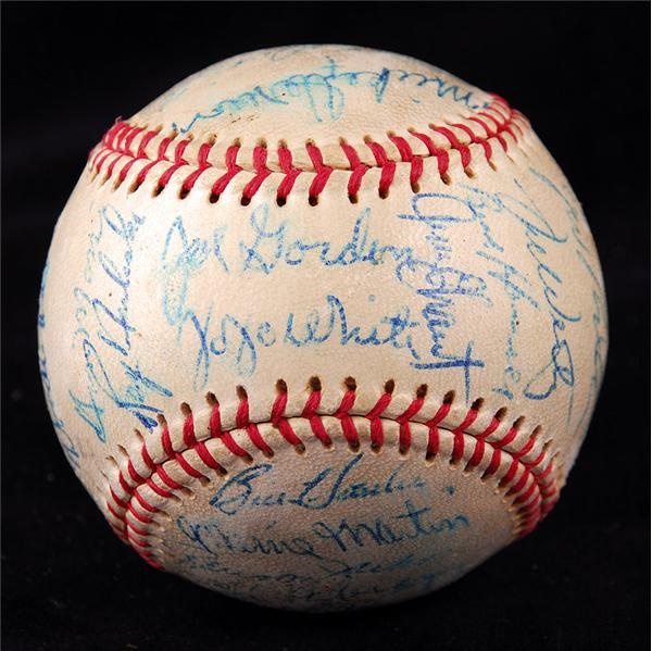 Wilson Official League Baseball signed by 31 members of the team including Earl Averill, Hoyt Wilhelm, Larry Doby, Vic Wertz, Joe Gordon, Minnie Minoso, Gary Bell, JoJo White and more. No Maris. Some of the signatures have some smudges. All signed in blue ballpoint and grade 6-8 on scale of 1-10.