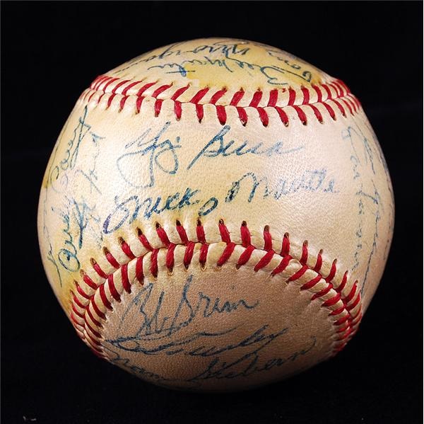 The 1956 New York Yankees were World Series champs by virtue of their seven game win over the Brooklyn Dodgers. This team signed (26) OAL (Harridge) ball is signed on the sweetspot by HOFers Yogi Berra and Mickey Mantle. It is also signed by Phil Rizzuto, Elston Howard, Billy Martin, Whitey Ford, Norm Siebern and Don Larsen. Interestingly, Larsen pitched his perfect game in the 1956 Series game 5. Signatures average an 8. Ball is cream colored with some toning under the light shellacked finish.