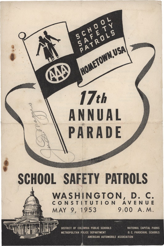 Original program from "17th Annual Parade" for "School Safety Patrols Washington D.C. Constitution Avenue May 9th, 1953 9:00 A.M." Joe DiMaggio was honorary Grand Marshall of the parade, as listed inside the program. Signature in pencil along flag pole of picture on left hand side of program. Actual program has creases as if folded in four with two different stain marks on edges, not near signature. Overall in excellent condition