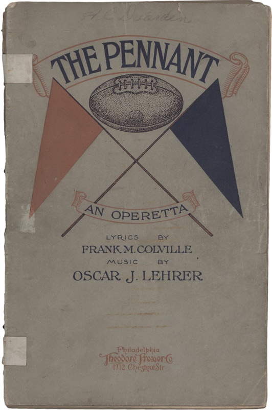 An original version of "The Pennant An Operetta" lyrics by Frank M. Colville and Music by Oscar J. Lehrer. "A comic operetta in two acts, especially adapted for school and college entertainments." Copyright 1912 by Theo Presser Co. Cover secured by tape to protect inside contents. Back cover has three inch tear in middle of bottom section. Inside pages in excellent condition, 117 pages total.