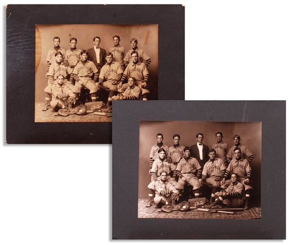 Two identical photographs of the 1902 Edmunds Baseball Team. Both mounted on black mat board, actual photos measure 9 5/8" X 7 5/8" and mounted size is 11" X 14". One photo has large 3 inch stain from some type of liquid on left side that infringes on photo, as well as some random splotches and marks in the background and is overall slightly faded. Second photo is in excellent condition.