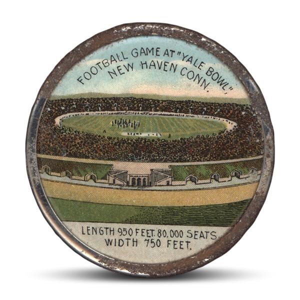 Rare pin with wording "Football Game At "Yale Bowl" New Haven Conn." and "Length 950 Feet 80,000 seats width 750 Feet". A painted picture of the Yale Bowl stadium is the background for the pin. The outside metal ring around the picture is rusted due to its age and the back is missing the actual pin. Good condition for a rare find.