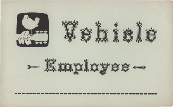 5" X 8" Original Woodstock Vehicle Employee Pass. Small Woodstock emblem of a bird on the end of a guitar in left corner and the words "Vehicle Employee" printed on light green card stock. Edges very slightly browned from age. No creases or marks on paper. Near mint condition.