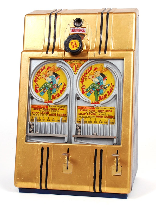 Coin operated game "Mexican" baseball. "For your amusement" insert coin, turn knob as arrow directs, snap lever in same field and shoot for high score. Game is 13" x 20" x 9" and weighs approximately 30lbs. Game is in EX condition and operational. "A game of skill!"