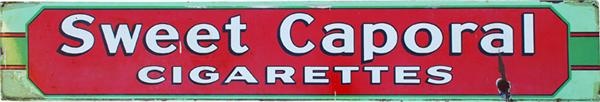 Large porcelain over metal sign measuring 13" X 6' 6 1/4". Sign reads "Sweet Caporal Cigarettes" Outlined in green with red background and white lettering outlined in black. Some porcelain missing on lower right edge 1" X 5" and other small scratches. Overall in very good condition.
