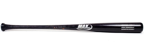 34 " Max Bat model RZ11 game used by Ryan Zimmerman of the Washington Nationals in 2007. The bat shows good use with loads of pine tar on the handle and ball marks on the barrel. The knob end has "11" written in silver paint pen and the length and weight (34/32) are written in the barrel end.