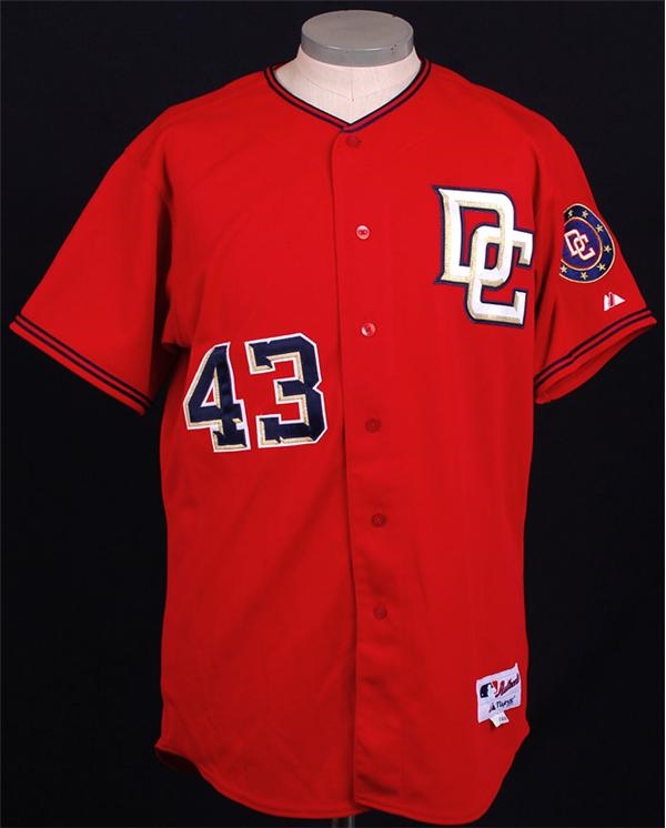 Relief pitcher Bill Bray spent his 2006 rookie season with the Washington Nationals. Here is a red, alternate Nationals jersey worn by Bray that year. It has the Majestic Authentic manufacturer tag, size 48 and 2006 flag tags on the front tail. An additional size tag and 0062 tag are sewn into an inside seam. Light use.