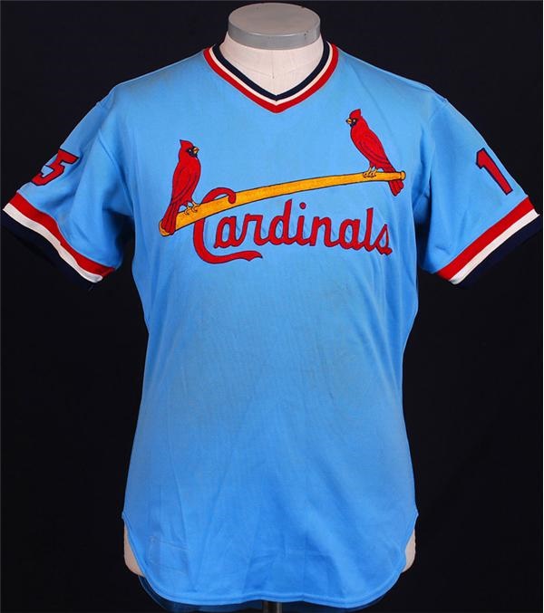 This light blue St. Louis Cardinals road jersey was game used by coach Dave Ricketts in 1979. The Rawlings size 44 manufacturer tag and "Set 1 1979" flag tag are sewn inside the front tail. The jersey displays heavy use with dirt stains on front and back and sweat stains in the collar.
