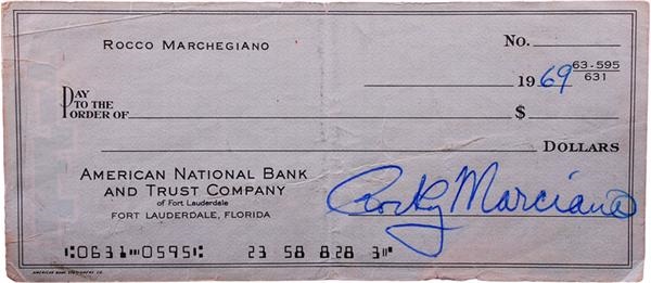 Personal check signed in bold blue ballpoint. The check is not filled out, just signed. Dated 1969. Vertical fold and corner wear. Check is VG, signature EX-MT. JSA LOA.