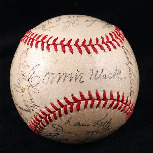 Reach Official League Baseball signed by members of the 1949 Philadelphia Athletics including Connie Mack, Nelson Fox, Al Simmons and more. Sealed in a ball cube, authenticated and graded by PSA as a Near Mint 7.
