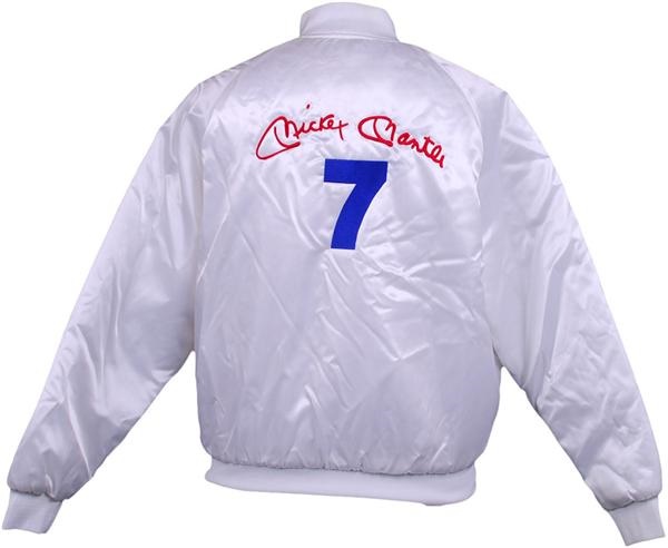 White satin nylon quilted button front jacket with elastic waistband and wrists. Inside tag on collar reads "Satins Made in U.S.A. X-Large". On left front breast small two inch blue baseball embroidered with the number "7" in white and "Mickey Mantle" in red. "Mickey Mantle No. 7" signed in blue ball point pen below embroidered baseball. On back embroidered in red lettering "Mickey Mantle" and in blue the number "7". In near mint condition. LOA from Mickey Mantle's sister in law.