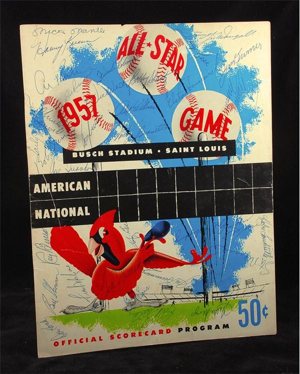 Cover only to the 1957 All-Star game program signed by 33 players including Mickey Mantle, Willie Mays, Al Kaline, Yogi Berra, Early Wynn, Jim Bunning, Stan Musial, Ted Williams, Don Hoak, Elston Howard and more. All signed in bold blue ballpoint. JSA LOA.