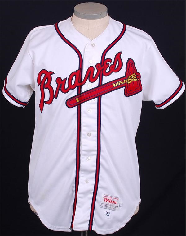 This is a game worn white jersey. Embroidered tag on bottom left front "Tailored exclusively for Prestige Teams by Wilson" Size "46" and number "92" for the year, embroidered patch sewn below Wilson tag. On back "Justice" and "23". Sweat marks seen on inside of collar and dirt stains on front but in excellent condition.
