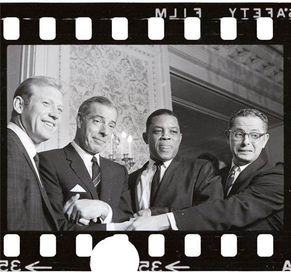 Four original 35mm negatives picturing Joe DiMaggio, Willie Mays and Mickey Mantle at Joe's 55th Birthday in 1969. Also includes two 16 x 20'' photos developed from one of the negs (one is sepia toned). Mint.